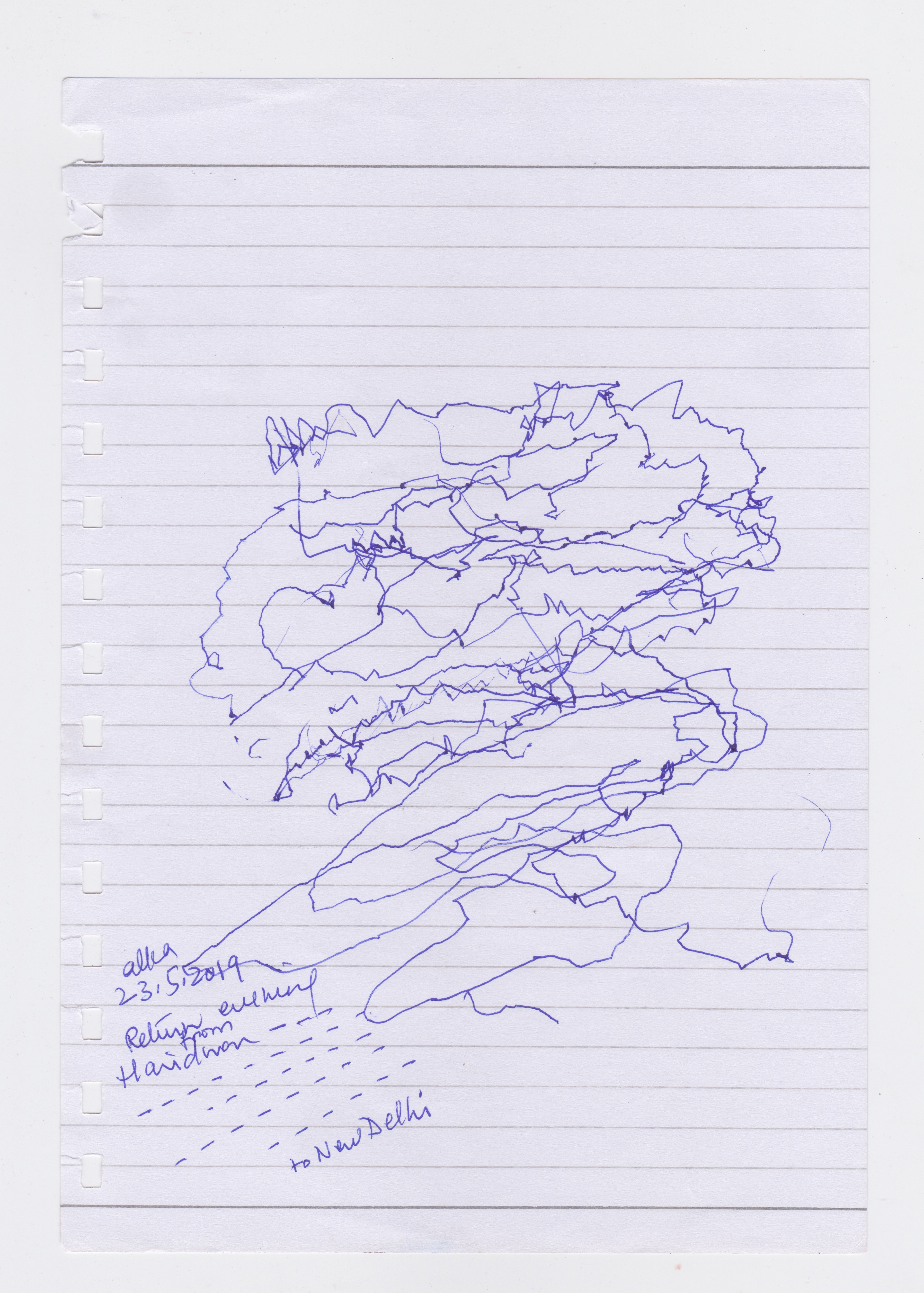 These drawings on notepad papers, started in 2014 whilst travelling in a car from one point to another. Looking out of the window whilst listening to meditative music, the drawings followed their own course with the bumps, twists and turns of the road, on whatever paper and pen I found or had upon my person.