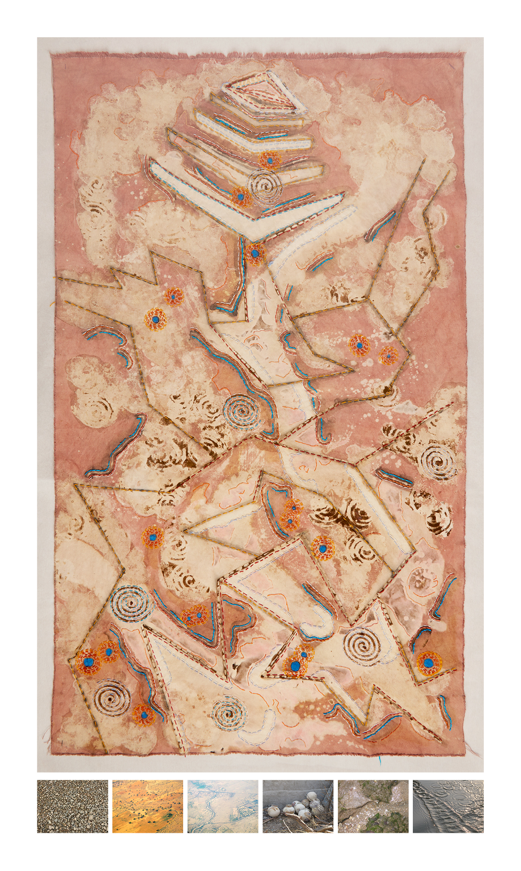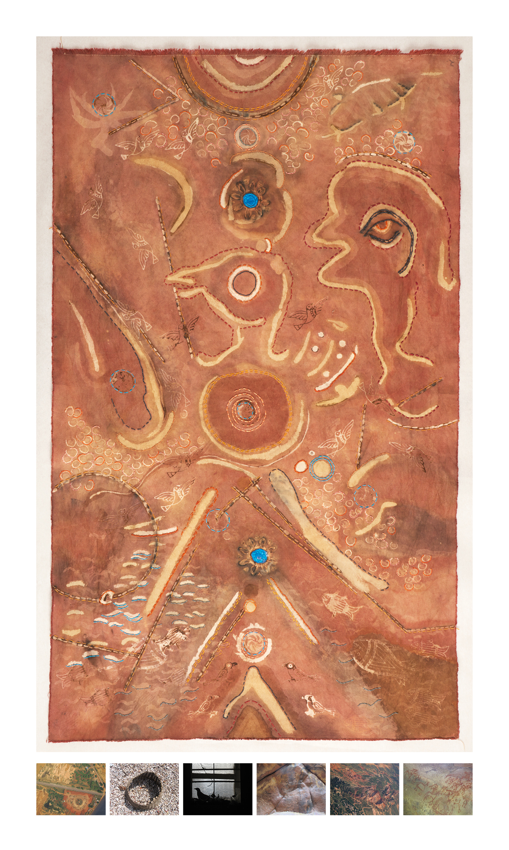 Natural dye, found objects, metallic paints, pen and ink and thread on handmade paper